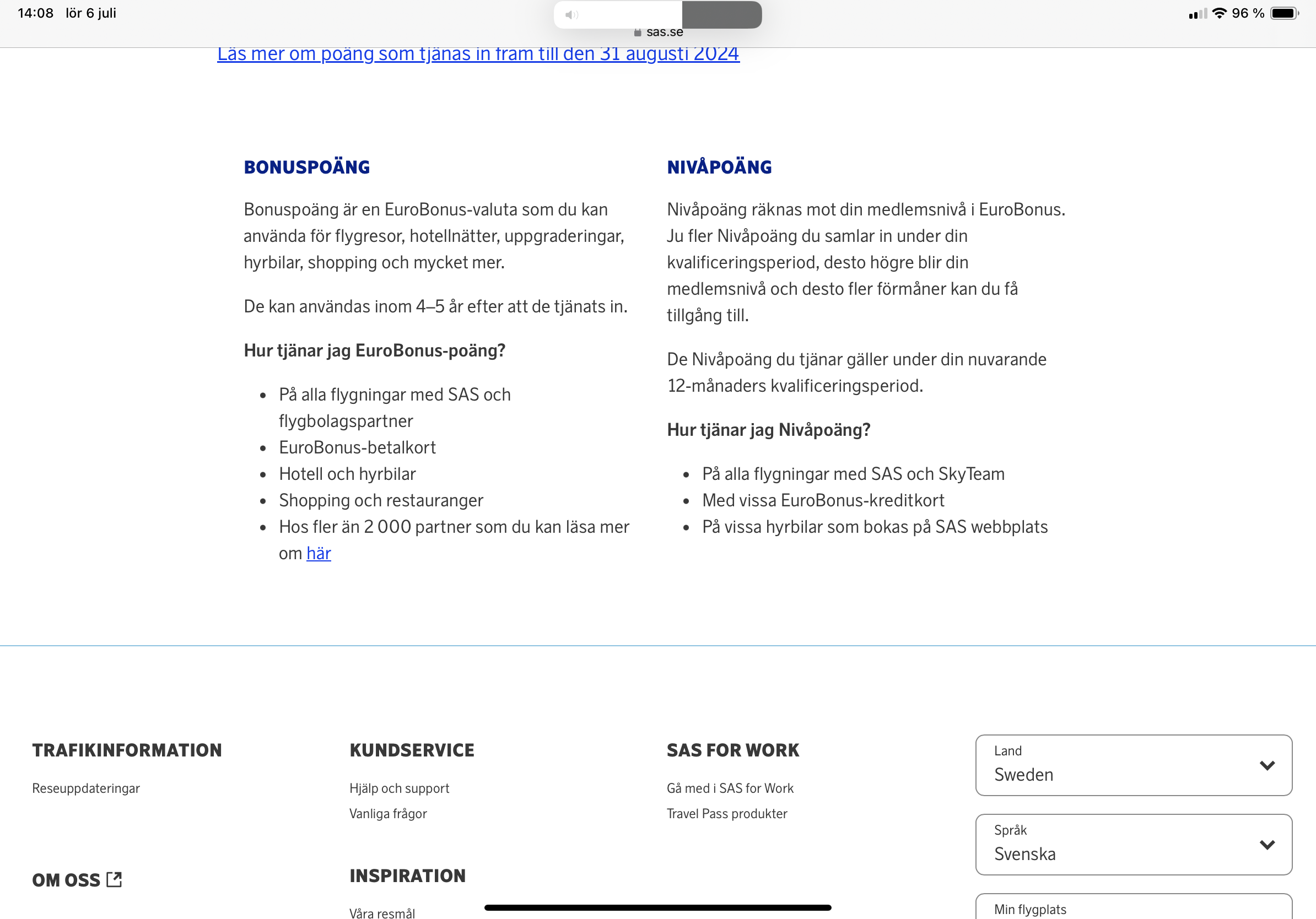Tabeller finns på https://www.sas.se/eurobonus/partners/flygbolag/scandinavian-airlines/