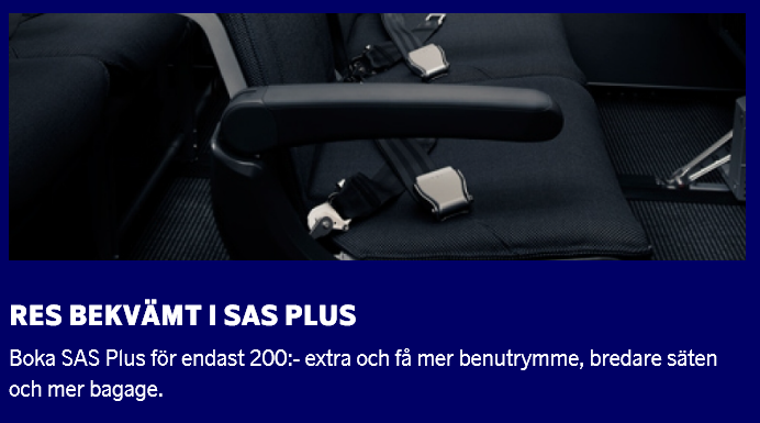 Reklamen är ju dock helt felaktig, det är inte mer benutrymme eller bredare stol man får för 200 kronor. 200 kronor extra för plus gäller intra europa och inte longhaul.