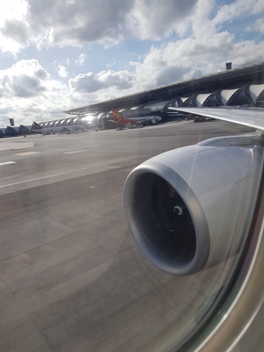 Till Singapore så var det en B777-300ER och jag hade plats precis framför motorn på höger sida. Det är rätt bra tryck i dom och låter en hel del vid start.