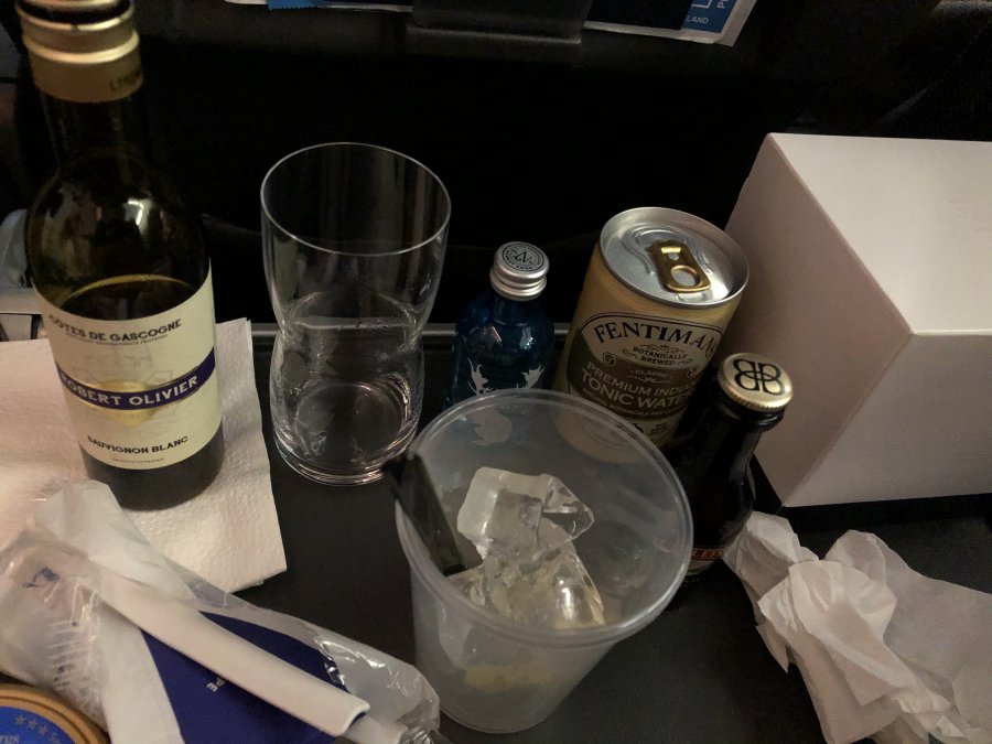 En smidig flight utan förseningar, vilket var det viktigaste, och bra service. Kuben som jag normalt sett tycker är ok smakade direkt illa, likaså det vita vinet. GT och praliner smakade dock utmärkt.