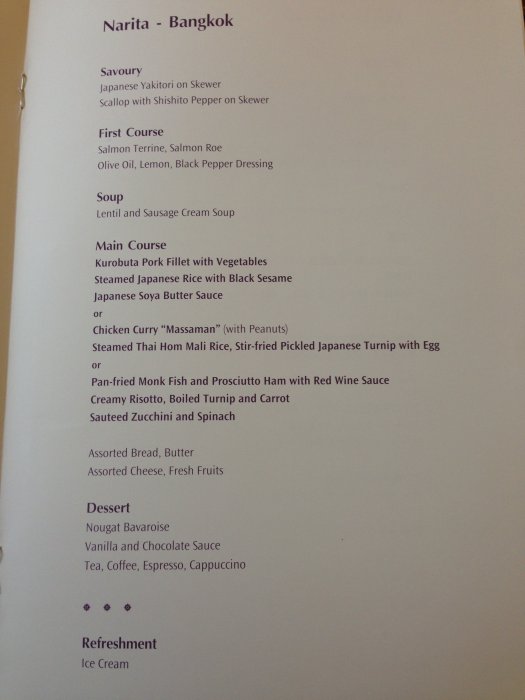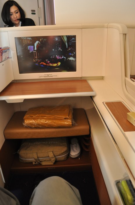 Vid det här laget var man mätt och hjärnan lagom marinerad. Jag bytte till pyjamas men hade svårt att somna. Den inre klockan vägrade, då vi ju skulle komma fram till Bangkok kl 23.38 Londontid, vilket är före min vanliga sovatid. Lade litet patiens och läste. Frukosten var god men hur kul kan en frukost bli över huvud taget och då dessutom på ett flygplan - ens i första klass? Några Cola senare kom personalen och tackade för att vi hade rest med Thai och hoppades att vi snart skulle åka med dem igen - vilket vi ju skulle sisådär tre timmar senare.
