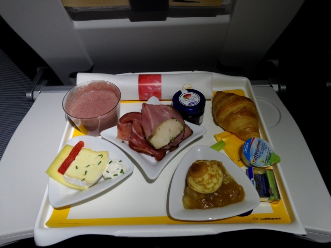 Hade inför den här flygningen bestämt mig för att sova. Stolen är ju trots allt den största skillnaden jämfört med economy. Hade taktiken klar för mig; sova lite natten innan, inte dricka mycket alkohol eller kaffe, men däremot dricka vatten. Alla förberedelser var gjorda, men sömnen infann sig inte direkt. Bytte om till en på tok för varm pyjamas som jag hade med mig. Låg och slumrade en timma innan jag var på väg att ge upp, men sen somnade jag hårt och fick väl en 2-3 timmars väldigt god sömn. Vaknade precis när frukostvagnen rullade förbi vid 0445. Flygvärdinnorna noterade detta och gav mig en frukostbricka serverat med ett leende och en blinkning.