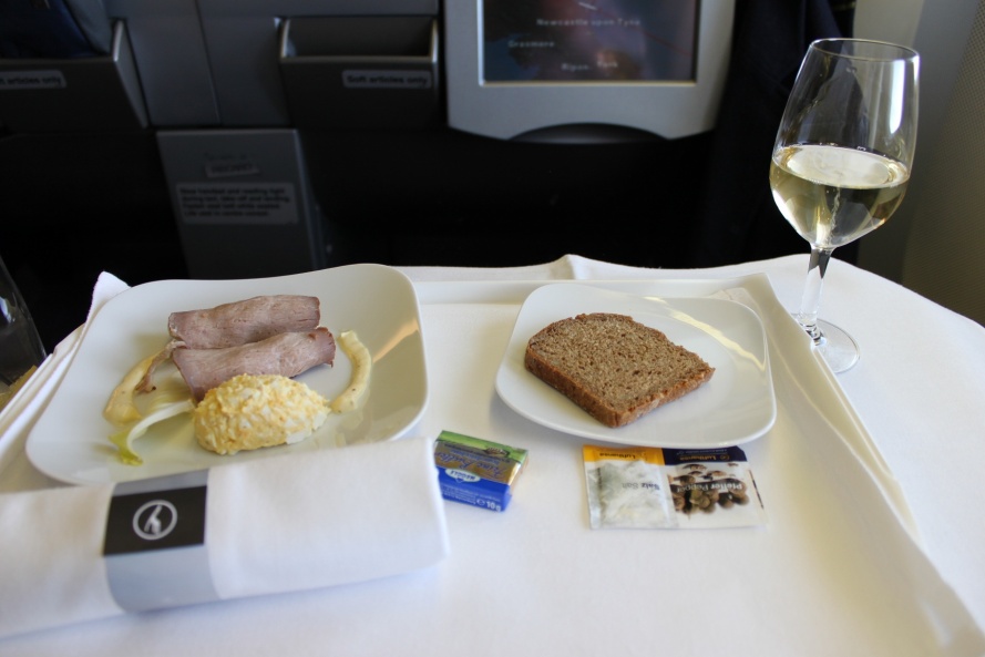 Prioboarding erbjöds och jag var en av de första ombord. Det var fullt i ekonomi och några lediga på de 3 raderna business som fanns. Times erbjöds som magasin och det fanns även tidningar i gaten. Vi startade vid 10:20 och väl uppe i luften drogs skynket för och serveringen kunde börja. På denna morgonflygning erbjöds en kall frukostbricka och eftersom klockan var efter 10 blev det några glas mousserande till den. Flera andra i kabinen inspirerades av detta och beställde samma. Till slut fick de öppna en till flaska!
