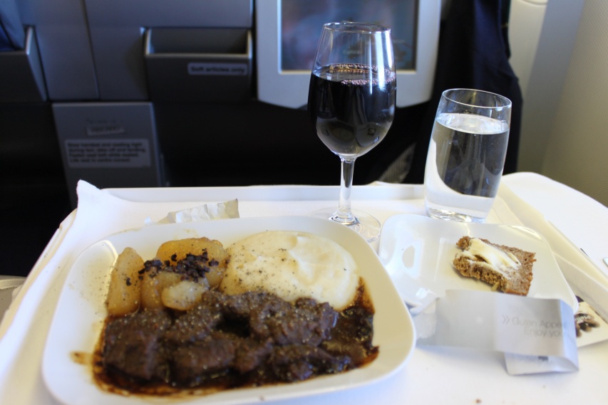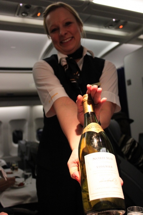 Till förrätt blev det Sea food salad with Cilantro dressing som accompagnerades av ett vitt vin, Laurent Miquel 2009 Nord Sud Viognier. Det vinet var egentligen avsett för förstaklass, men just idag så kunde även vi vanliga dödliga i business få en smak av första klassens dryck berättade denna trevliga flygvärdinna som även gav en presentation av andra klassens dryck. Smaken på det vinet var i en helt annan dimension.