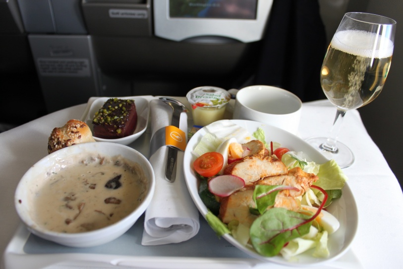 Innan landning serverades en lättare måltid med god svampsoppa och kycklingsallad. Desserten var någon chokladkaka som inte var något vidare. Fick bli Champagne där med.