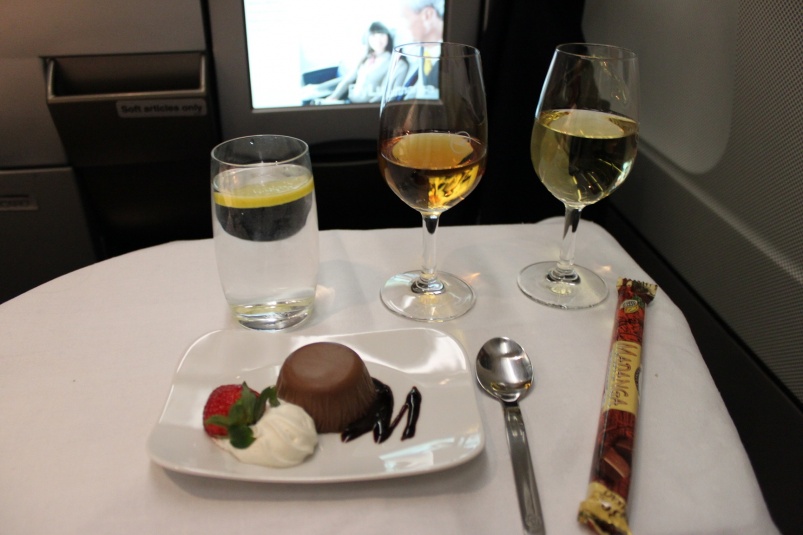 Dessertvagnen rullade förbi och jag tog Chocolate and coffee cream, pear compote and caramel mousse. Lyckades även flörta mig till en fruktsallad av den enda leende flygvärdinnan. Kaffe och portvin till detta.
