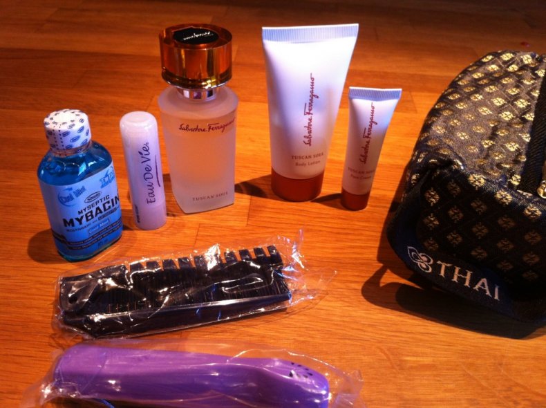 EDIT: Någon yngre familjemedlem verkar ha blandat innehållet. Jag skrev tidigare att detta kom från Thai (med anledning av väskan) - men jag är ganska säker på att Salvatore Ferragamo-prylarna kommer från Singapore Airlines då det låg en tom grön "aigner"-väska intill med SQ och Ferragamo-logga på. Hmm... Beklagar desinformationen.