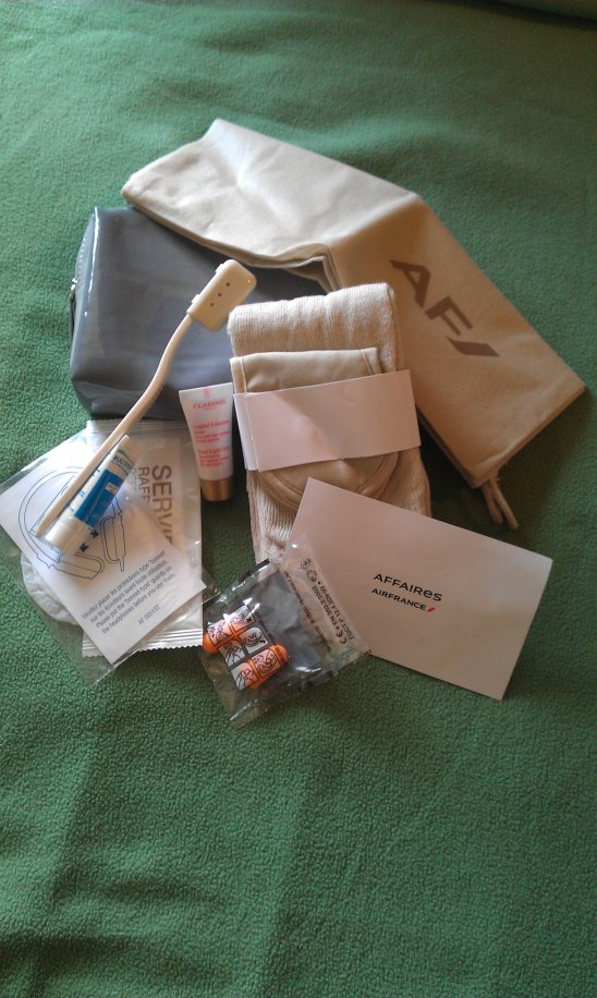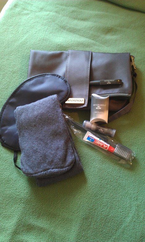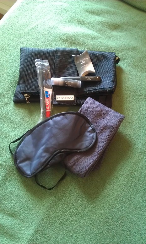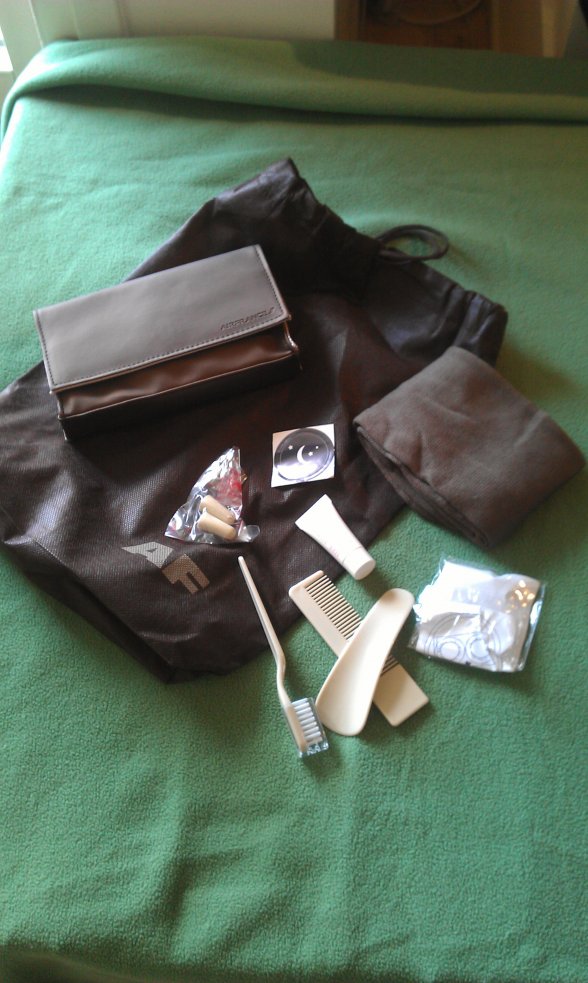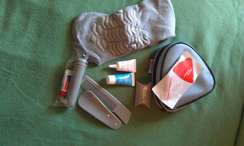 Innehåll: Skopåse, strumpor, ögonbindel (saknas i bild), skohorn, kam, tandborste, någon slags hurkräm, öronproppar, klister märke "do not wake me", samt överdrag till hörlurarna.