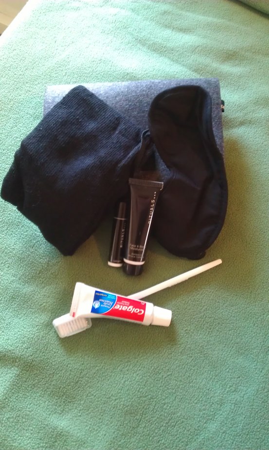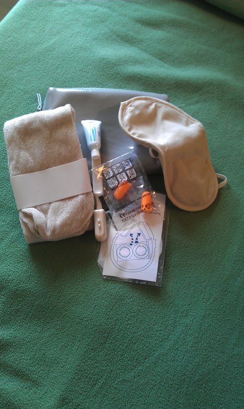 Innehåll: Strumpor, ögonbindel, tandborste med tandkräm, öronproppar samt överdrag till hörlurarna.