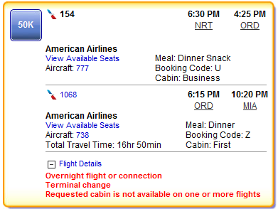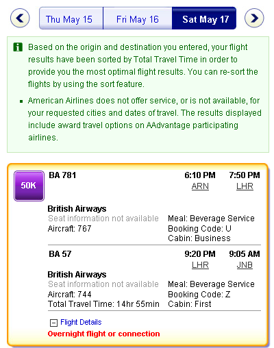 Om man är beredd att ta smällen av bränsletillägget på British Airways flygning, kan man flyga mellan Europa och Sydafrika för 37.500 AA miles i Business class, 50.000 AA miles i First class per enkel väg.