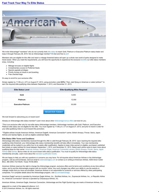 Simply register by 11:59 p.m. (CT) on August 27, 2013, using promotion code H3TLI. Then, start flying on American or select airlines** to earn the required elite-qualifying miles between September 1, 2013, and December 31, 2013.