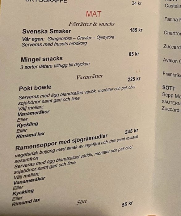 Detta var den digra mat-menyn... Nej, men en ramensoppa med kyckling och en "Svenska smaker" kan man väl kosta på sig. Inget vidare billigt kanske och lite märkligt urval av rätter, men ok då. Man får ju unna sig. Inga problem säger servitören. Efter relativt lång väntan kommer så en ramensoppa med kyckling in till mitt sällskap, samt en tallrik med skagenröra och en brödkorg till mig.