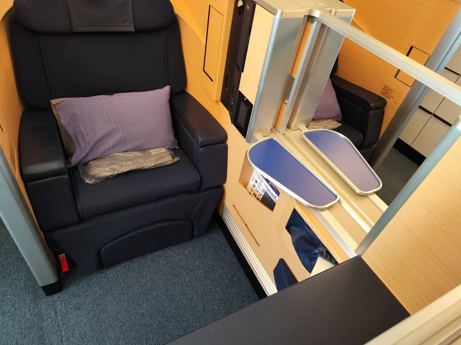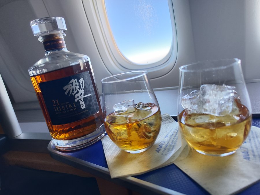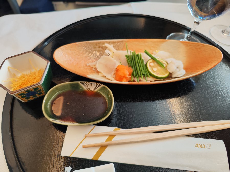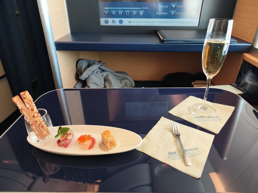 Check-in, security och ANA:s suite lounge har fungerat bra, inget särskilt uppseendeväckande. Bara 2/8 platser i first upptagna. Av skatteskäl(?) serverade de en billigare pre-departure champagne.