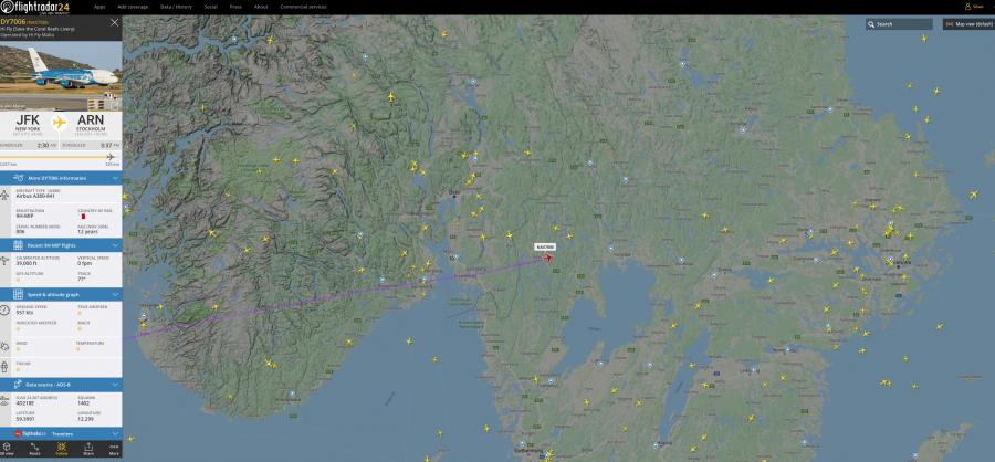 Kom precis till utsiktsplatsen, fler här som vill se en 380Jadå de är på väg har just passerat in över Sverige och är strax utanför Karlstad så borde vara typ 40 min kvar till Arlanda.