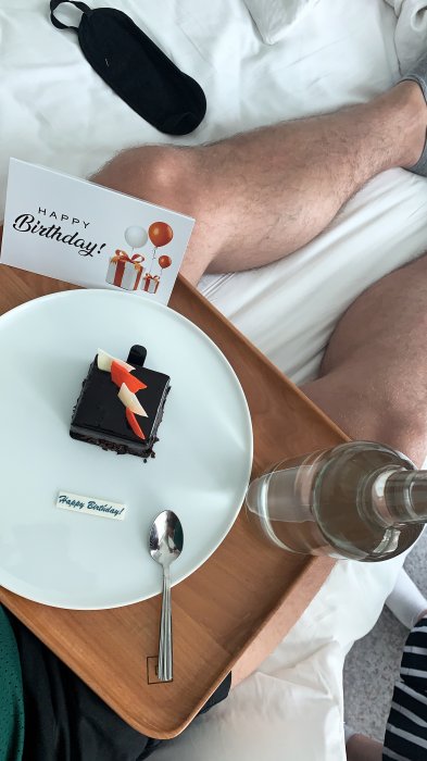 Jag fyllde år medan vi bodde på Cordis, och det blir lillasysters tur att överraska mig. Efter att ha viskat med personalen i smyg i repan fixar de ett besök på födelsedagsmorgonen då jag får en chokladtårtbit, ett doftljus, och en glasflaska vatten (oklart varför?).