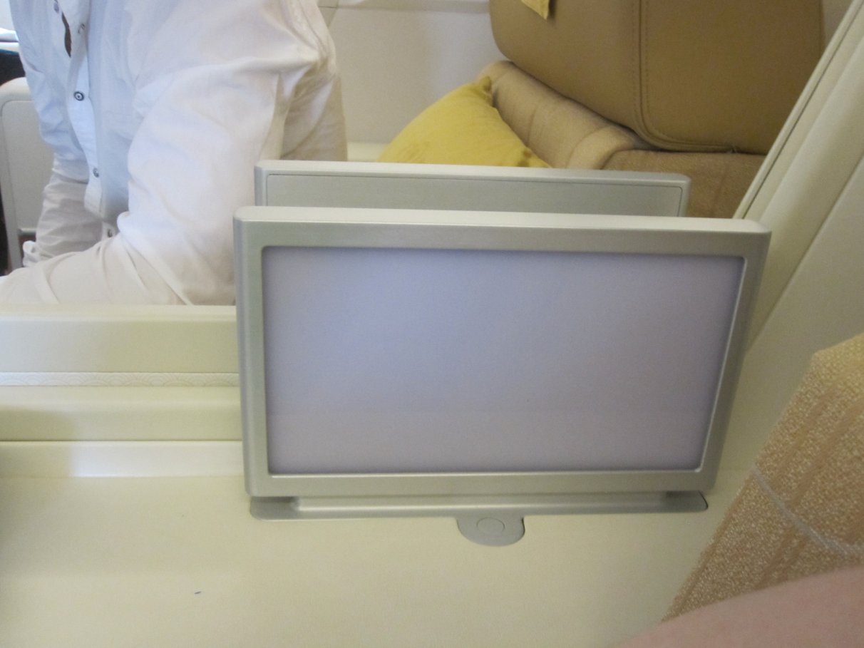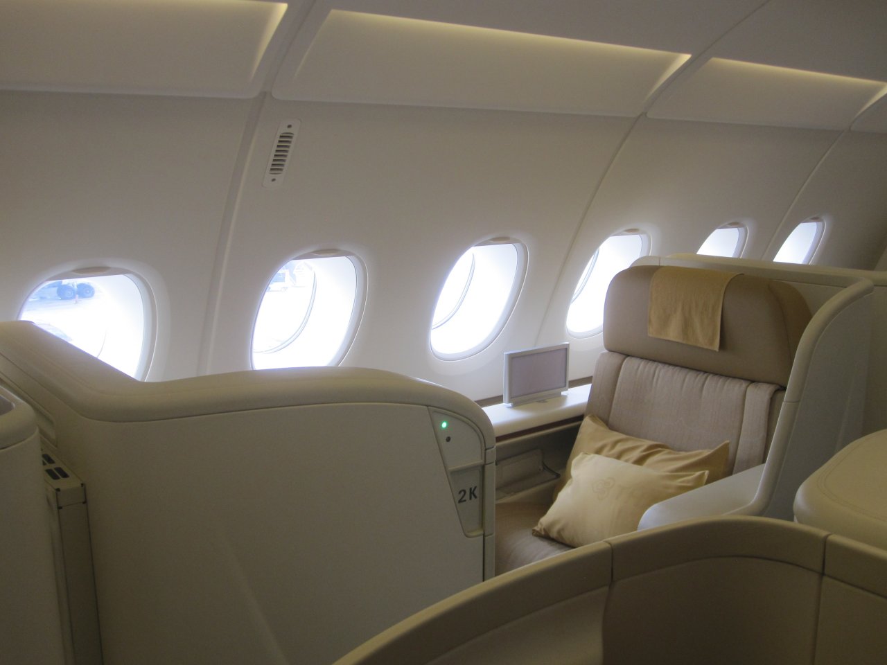 Vi blev upphämtade i loungen vid final call och eskorterade till gaten. En kortare promenad på 5 minunter. Ombordstigningen gick, trots mängden pax, smidigt. Det var fullt hus i F och några enstaka stolar kvar i C och M. Det första som slog oss när vi steg in i F kabinen var hur vitt allt var, stor skillnad mot deras klassiska lila färgkombinationer som brukar överskölja kabinerna. En reflektion var att det var läckert. En annan var att interiören förmodligen snart kommer skina i en gråskalig färgnyans då det blir svårt polera fram de vita stolarna under all skit som redan började skönjas.