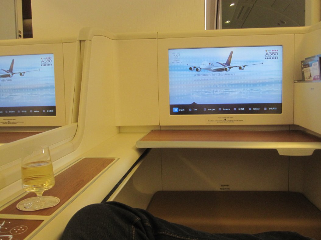 Förstaklass på Thais A380. Ett kärt återseende. Vi hann med ett snabbt stopp i Thais Royal First Lounge för en soppa och en kall liten kompis innan vi begav oss mot gaten.