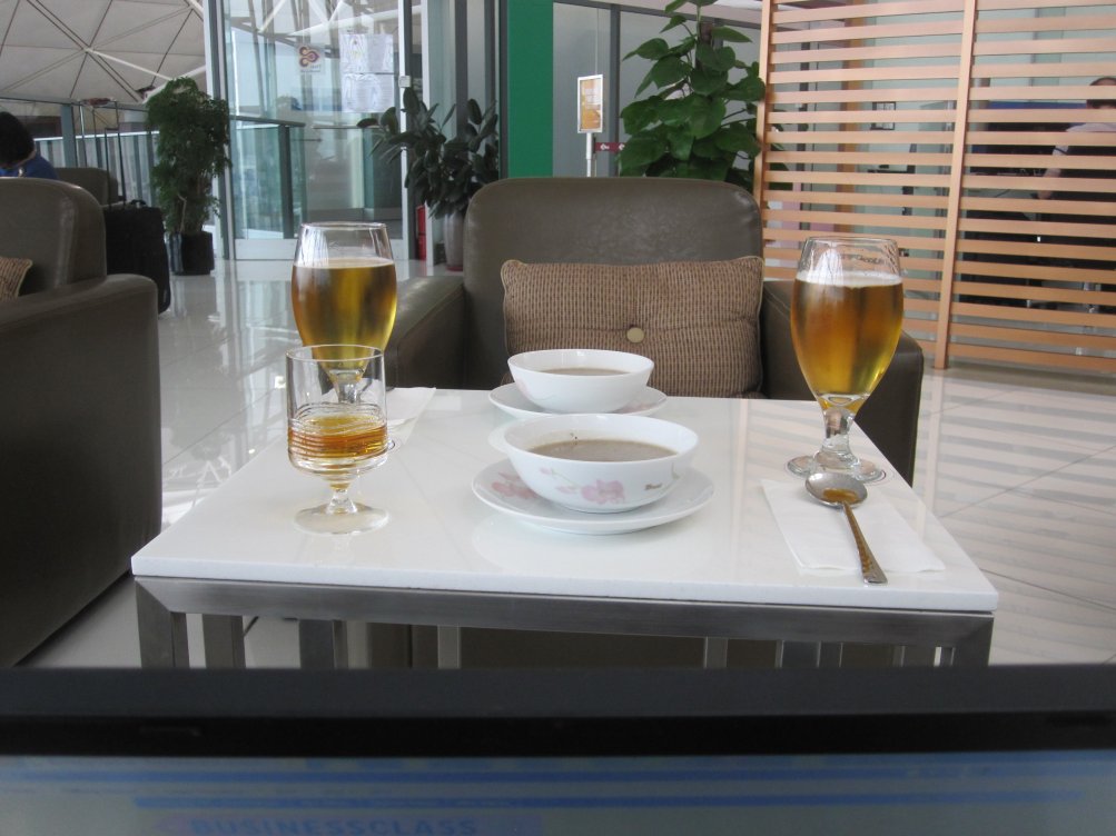 Efter att ha vilat ögonen några timmar i Asianas förstaklass lounge var det dags att vandra vidare mot nästa flyg som skulle ta oss tillbaka till Hong Kong. På denna flygning fanns det tyvärr heller ingen förstaklass, men då det knappt var halvfullt i C så kändes det som att vi trots det skulle överleva. Servicen sköttes med stil. Det räckte med att tänka tanken på att be om något så stod crewn brevid stolen och tog emot önskemål. Det var rakt igenom en väldigt trevlig flygning. Nu testade vi inte så mycket av maten men dryckerna satt precis där de skulle.