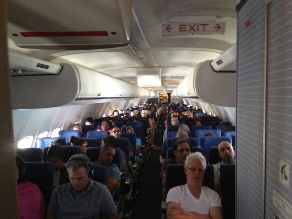 Snabb check-in, trots lång kö. Min polare hade två väskor, jag handbagage som vanligt. Nackdelen på Term A och B på EWR är att gaterna är placerat som små ”öar”. T.ex. så delar US Airways och AA en ”ö”. Det skapar en lång samt mycket trång passage för säkerhet. Det finns en AA Priority Access, men den hjälper inte så mycket. Standard TSA procedur med skor av, laptop (dock ej iPad) ur väskan och dessa nya röntgen maskiner. Det är tidigt som ’attan, och jag behöver kaffe! Allt som allt tar det ca 20min från Hilton bussen tills vi är genom. Tack för F och OW Emerald status. Vi hade fått veta att flighten var 30min då manskapet var sena kvällen innan, så vi hade bra med tid.