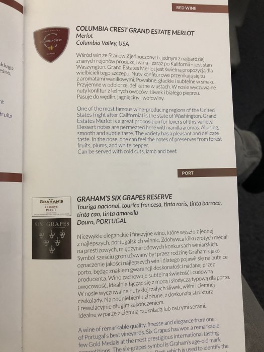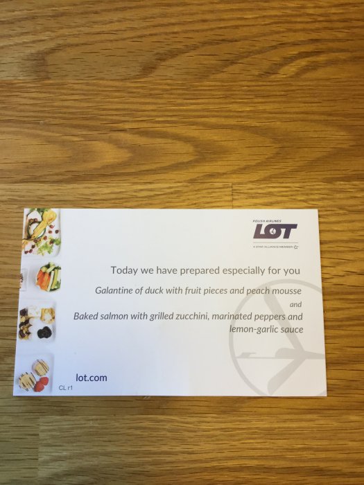 Väl uppe i luften påbörjades middagsserveringen. Jag hade bara ätit lunch och den lilla måltiden på LOT458 tidigare så jag var riktigt hungrig. Jag valde rökt lax till förrätt och stekt lax till huvudrätt. Till detta avnjöts ett gott vitt vin från Sicilien. Förrätten var bra men huvudrätten var bland det bästa jag ätit ombord på ett flyg, saftig och smakrik (däremot såg den lite trist ut men hellre det än tvärtom). Sedan blev det kaffe, dessert och avec. Glassen, med ngn form av bärkompott var riktigt god. Före landning (17.15 lokal tid) serverades en lättare måltid men då jag fortfarande var proppmätt så väljer jag att inte recensera denna, Frk Basic var dock inte alltför positiv. IFE hade mkt bra utbud av både nya och gamla filmer. Den hängde sig en gång men detta avhjälptes snabbt genom en omstart. Klart sämst var deras hörlurar då jag upplevde de som extremt små. Förbannade mig själv för att jag lämnat mina egna hemma - lesson learned. Servicen var uppmärksam och trevlig, så totalt sett gav flygningarna med LOT mersmak.