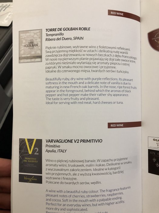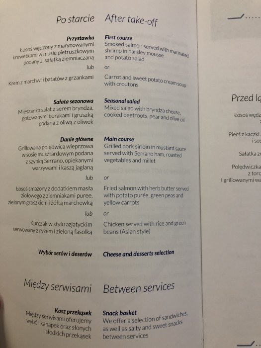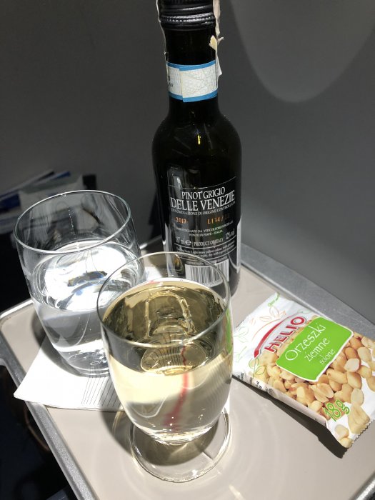 De två första raderna är business och man får en ”tvåa” själv, jag och Frk Basic satt på plats 1C+1D. Rekommenderar rad 1 då benutrymmet är riktigt bra (och bara marginellt smalare säten pga borden i armstöden). Vi serverades omgående en fördrink, vatten eller juice. Väl i luften serverades en lättare måltid som var riktigt fräsch och god. Denna sköljdes ned med ett gott vitt vin (jag är ingen kännare dock). Efter måltiden serverades kaffe och en polsk kexchoklad. Servicen var mkt uppmärksam och vänlig. En mkt trevlig flygning på ca 90 minuter.