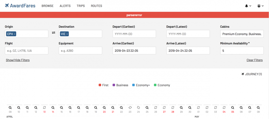 Såg dock att det var maintenance igår kväll på siten och sedan dess har jag fått upp felmeddelande "parse error" och custom searches fungerar inte riktigt som de ska (pilarna bara snurrar runt utan att uppdatera tillgängligheten, detta görs endast efter att man laddat om sidan).