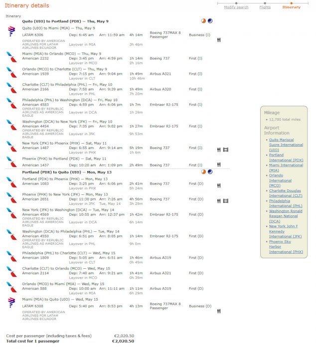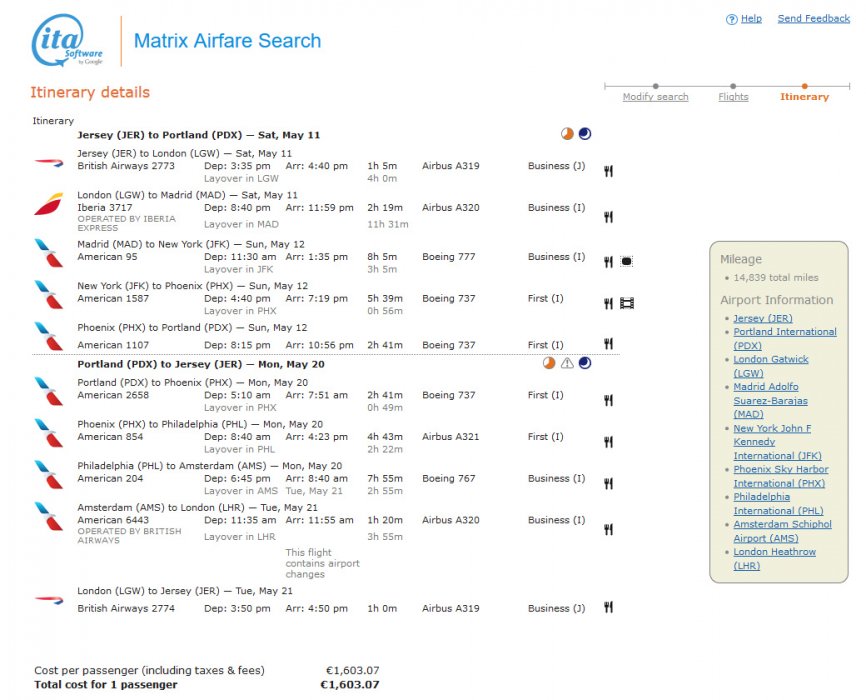 Bokningarna som är den egentliga TP run -strapatsen är JER-LGW-MAD-JFK-PHX-PDX, tillbaka PDX-PHX-PHL-AMS-LHR,LGW-JER och PDX-CLT-MIA-SAL, tillbaka samma SAL-MIA-CLT-PDX. Båda är biljetterade av AA. Dessutom så kommer det nivåpoäng från AGP-MAD-LON-JER och vice versa (biljetterad av BA), plus en retur med AY på HEL-AGP-HEL som ger 280 TPs. Det övriga som inte ger TPs är Guernsey och Alderney med Flybe (JER-GCI-JER) och Aurigny (GCI-ACI-GCI), som är det som jag kallade för annan flygnördskap och som jag gör för att avnjuta igen av Kanalöarna.
