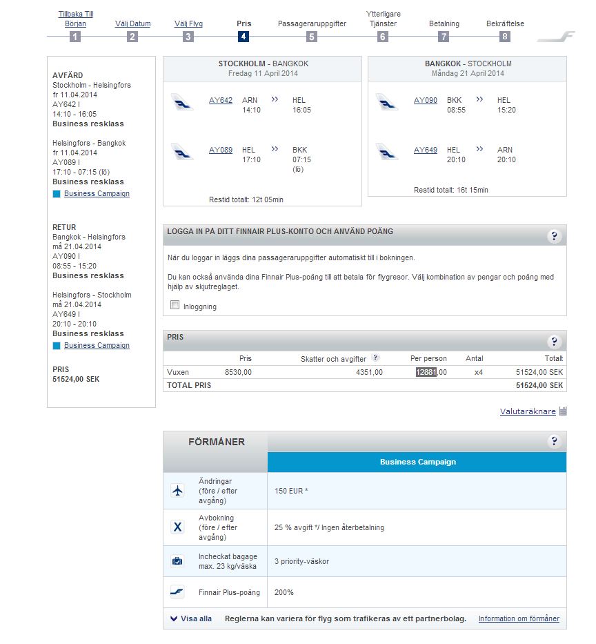 THAI Premium Economy (i Business class stol) kostar ca 13.800 SEK inkl. skatter.