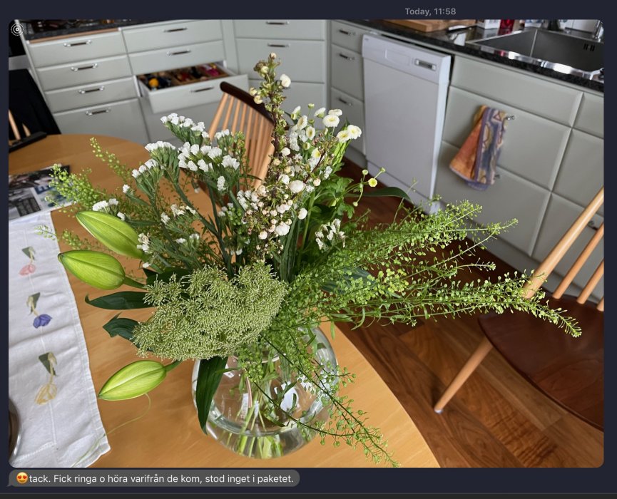 Vi fick buketten idag. Ganska stor och men väldigt grön och outslagen. Läste att den behöver någon dag på sig att slå ut. Vi får väl se hur det artar sig på den fronten till helgen.