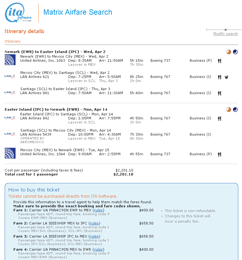 Det går också att kombinera med Uniteds P klass biljett från New York till Mexico City, så totalpriset från New York till Påskön T/R blir ca 15.000 SEK inkl. skatter.