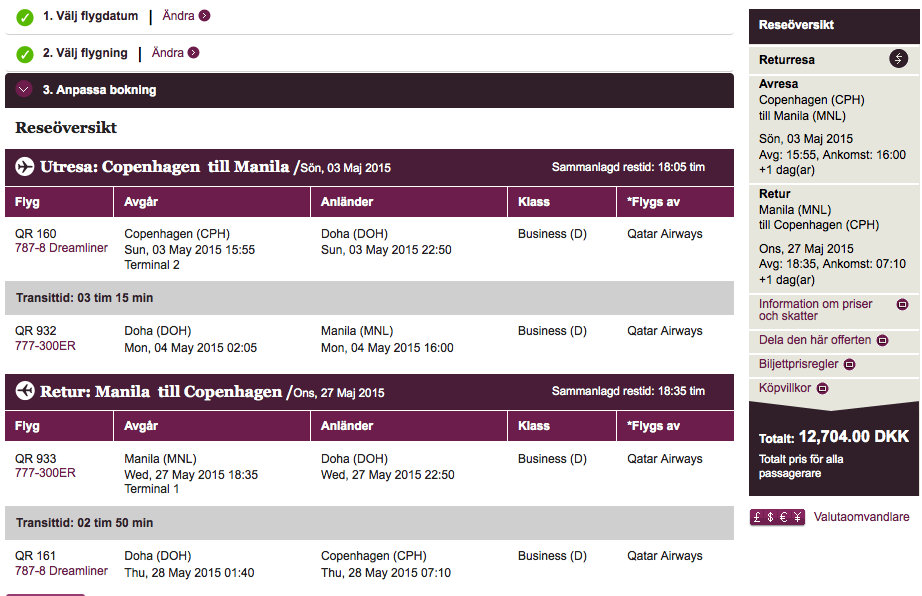 ... København til Manila - udrejse 3. maj og hjem 27. maj. Jeg får en samlet pris på DKK 12.704 retur - med fare basis DJGSP2PE. Til gengæld står der i restrictions - "Valid on QR Services Only. Tickets are non-refundable". Det virker vel til at der er en fejl et sted i booking systemet - prisen er også meget lavere end den QR annoncerer