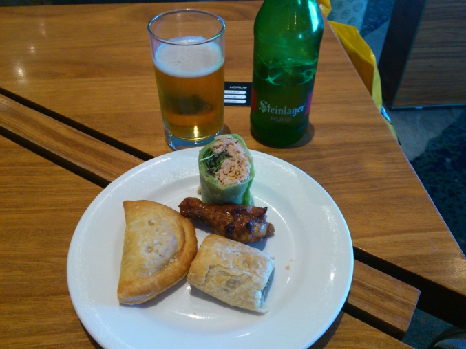 Äter lite diverse varmt och kallt småplock med en kall Steinlager till. Ska inte äta för mycket, då jag har 6 timmar med NZ's utmärkta ombordservice framför mig till RAR. Planet är sent hit, så de räknade med uppåt en timme sen avgång. Gör mig inget, då vi ska landa 05:30 och rummet är ledigt från 12:00.