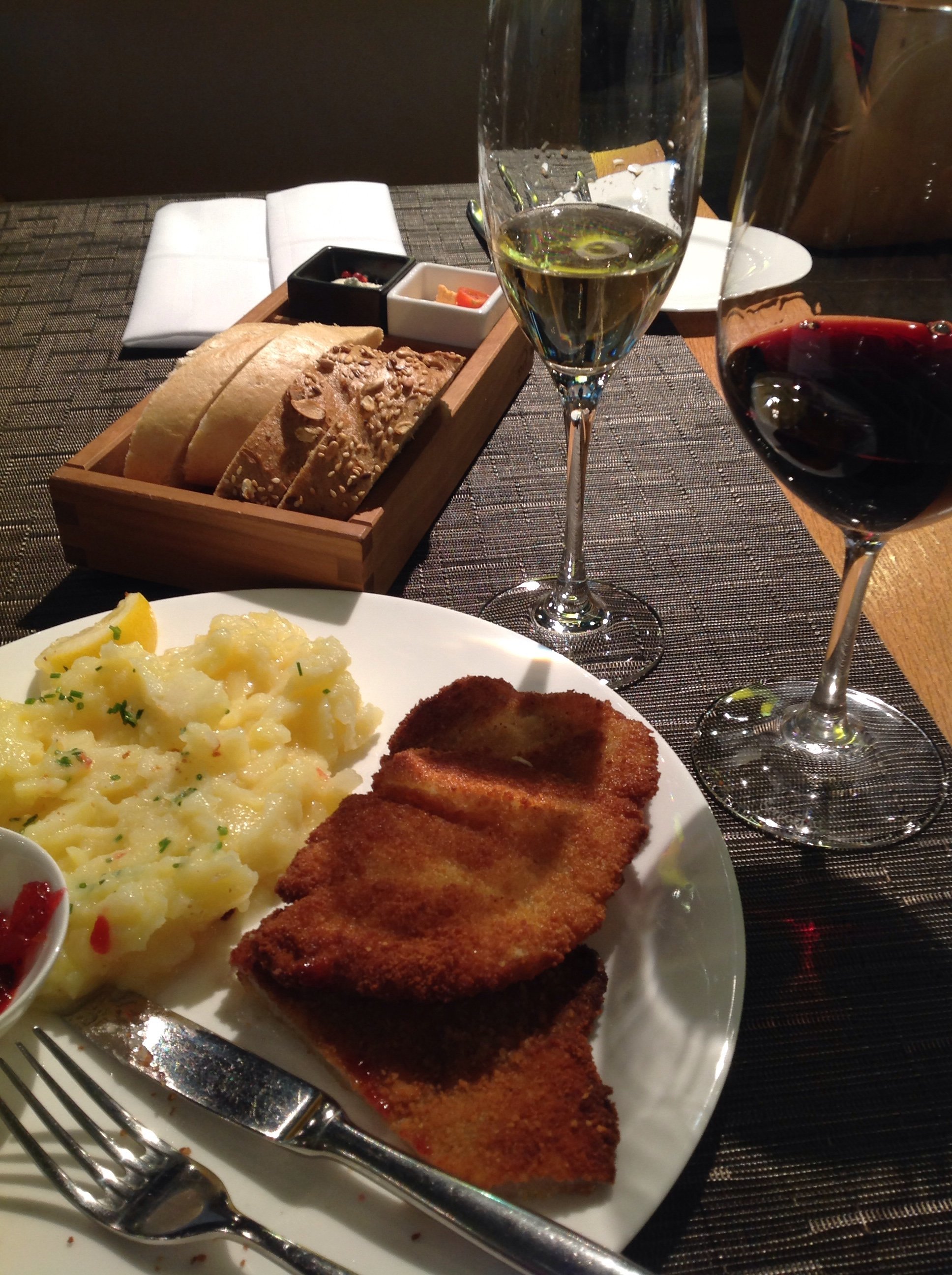 FCL Munchen, schnitzel, Pommery Louise, samt Torre Muga.