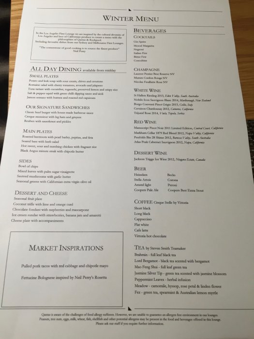 Utbudet av mat var inte lika stort och alternativen för mig var väldigt tunt. Mycket kallskuret och lite ostar var uppdukat på en köks-ö i mitten av "köket". Det övriga utbudet var Dim Sum och nudlar, men ingenting som passade mina matpreferenser. Smörgåsar, frukt och lite desserter fanns också men nådde inte upp till samma nivåer som EVA lounge. Glass från Häagen-Dazs fanns också, och glass är ju alltid ett plus.