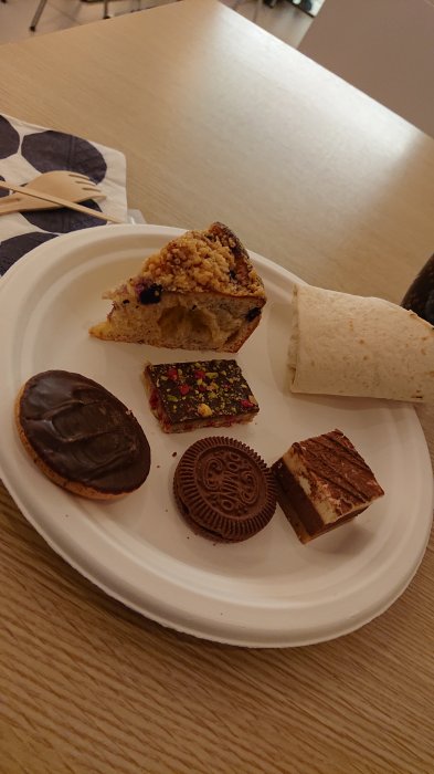 Hej från Finnair Helsingfors non-Schengen. Renovering pågår, så utbudet är begränsat, men kakbuffen generöst tilltagen.
