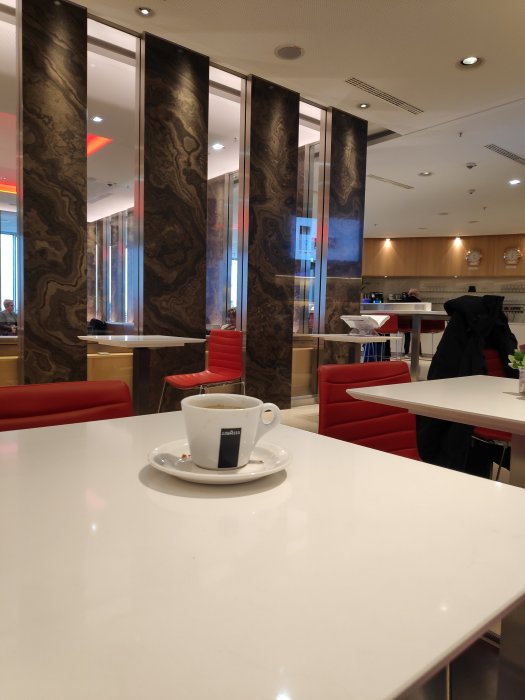 Vid 8-tiden på morgonen var det mycket folk och hög ljudnivå i loungen. Det lugnade dock ned sig när flygningarna mot Kina avgått.