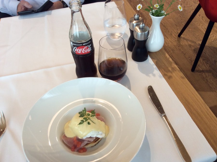 Swiss F loungen A piren på ZRH, jag åt inget på flyget utan väntade med att beställa Egg Benedict här i loungen, rätten är ju guds gåva till mänskligheten.
