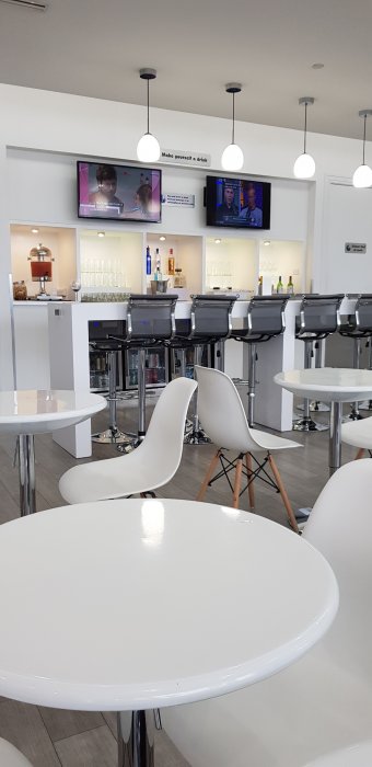Även om loungen nyligt byggts ut är det crowded. Snyggt, helt ok matutbud vid 19-tiden och med fin service i baren. Centurion dricker riktig Champagne medan vi andra Småplattar får nöja oss med Prosecco...