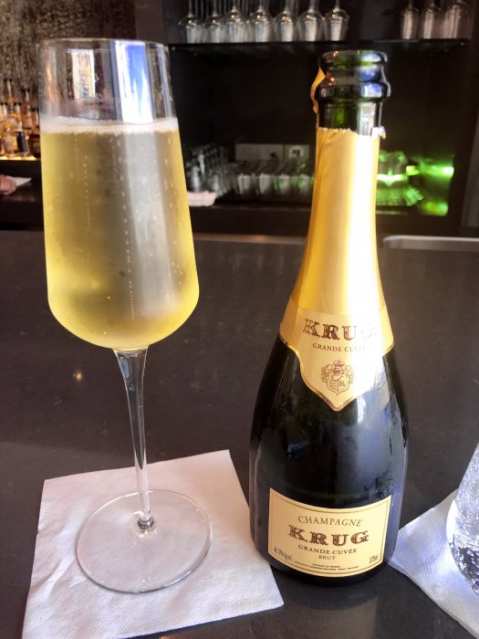 När jag var där var det Krug för hela slanten i augusti 2019. Precis innan pandemin så hade American enbart en liten handfull flighter per dag (typ LHR x 2 och GRU) med Flagship First ombord så British Airways First fick komma in. Man får en inbjudan i receptionen. Jag fick en efter lite flörtande