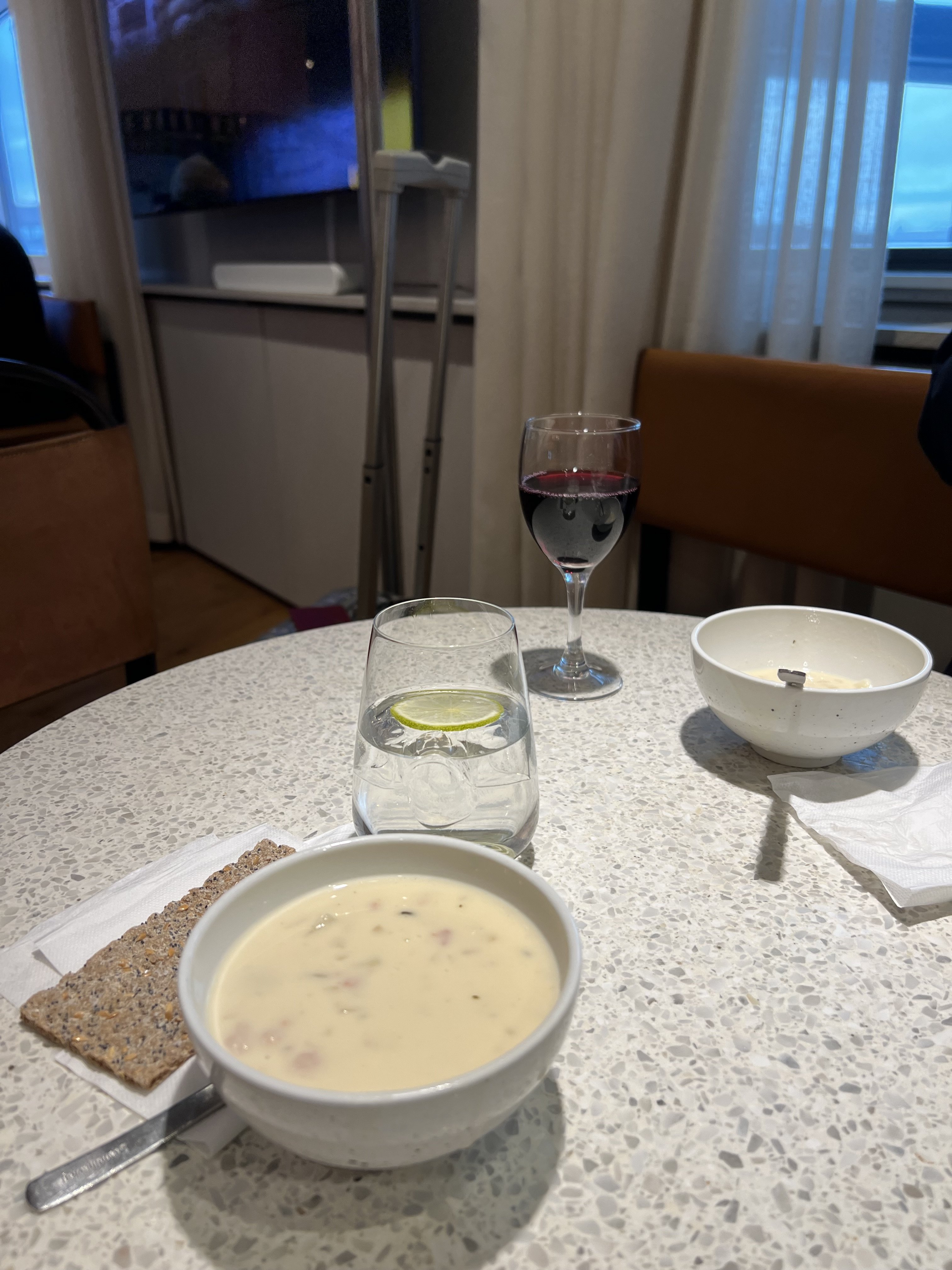 Ganska lugnt här för en söndagskväll, ingen koll på hur Asienflygen går men hade väntat mig lite mer fart. Misstänker dock att detta är lugnet efter stormen då det känns lite urplockat i buffén. Bröd, kallskuret, kalla röror, kycklingspett och nån böngryta med ris. Tuborg x2 samt en IPA i kranarna, inte undersökt övrigt dryckesutbud så noga än men det verkar finnas ganska gott om vin (åtminstone volymmässigt) i olika former.