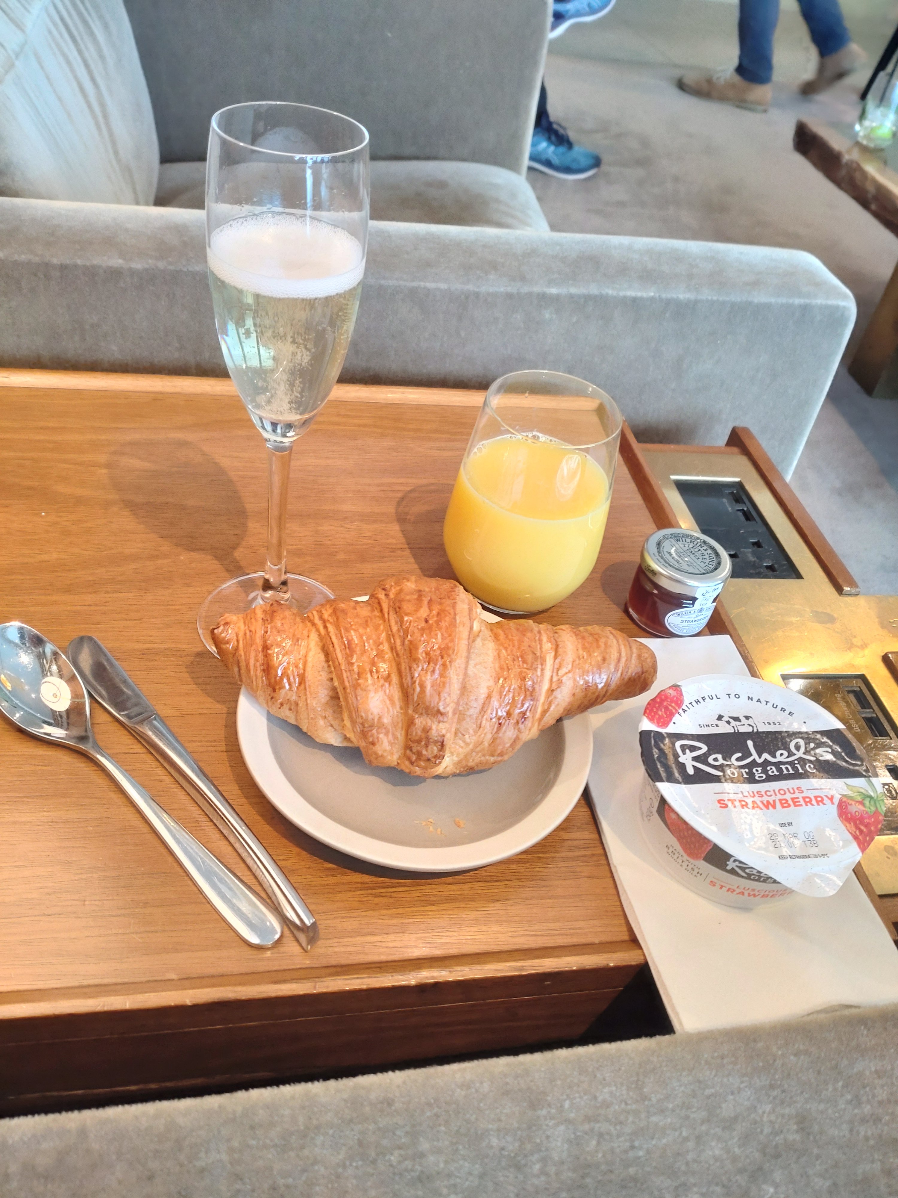 Första besöket här, och jag är inte jätteimponerad. Businessloungen bredvid är större och luftigare, och i vart fall frukostutbudet är ett snäpp bättre där än här. Dock vägs det upp av två sorters champagne med självservering.
