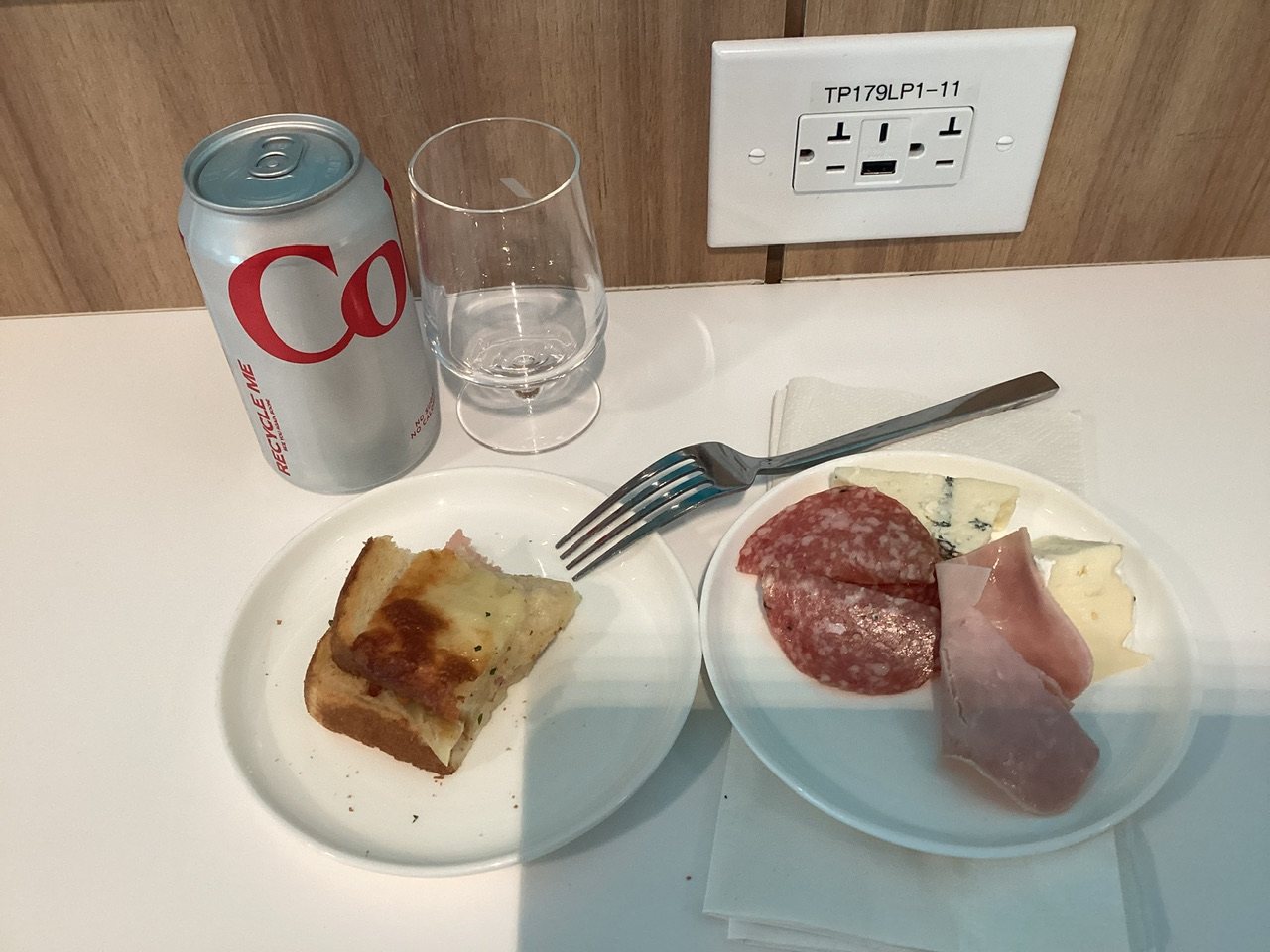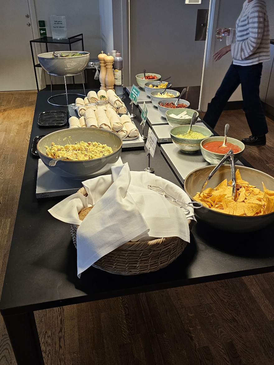 Lite kallskuret , varm macka och två varma rätter lax samt köttgryta är det som serveras.