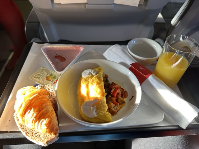 Dagens andra frukost. Omelett, jordgubbsyoghurt, och lite bröd. Jag är varken någon ägg- eller yoghurtperson när det kommer till frukost så åt lite av omeletten och lät yoghurten vara. Två rader framför gardinen och uppmärksam och trevlig service.