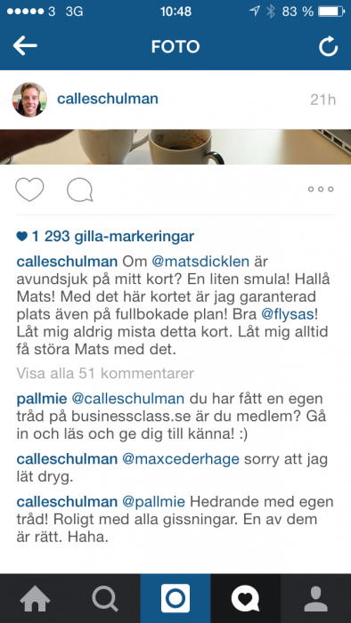 Vet inte om det var så mycket till svar, men tyder väl på att han inte flugit in kortet iaf. Hade han gjort det hade han nog berättat om det!Fick precis svar från Calleschulman på Instagram, se bild!