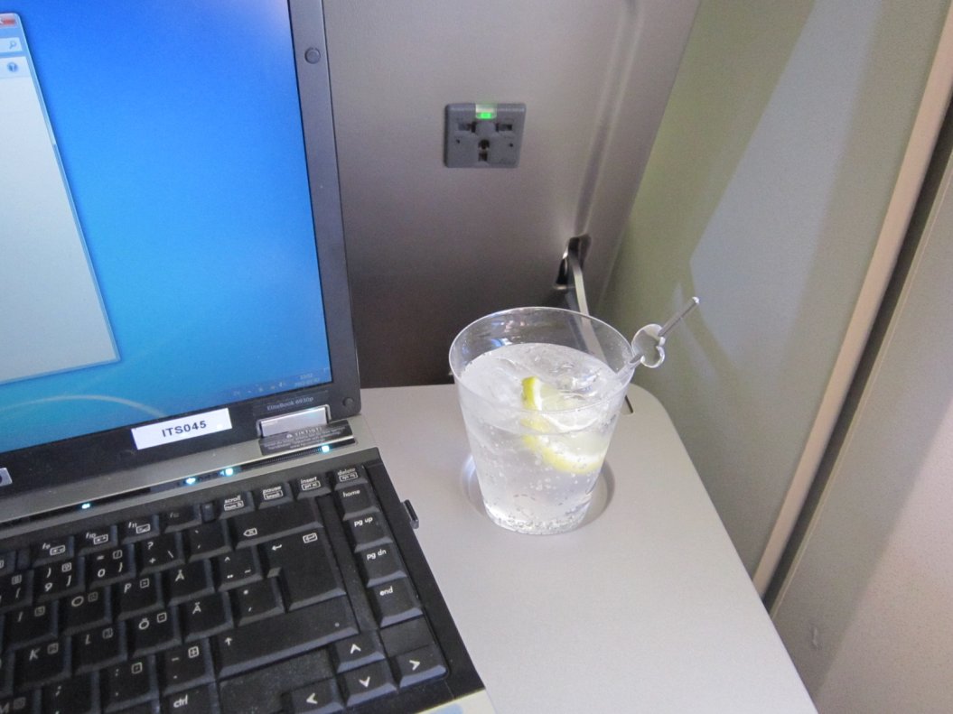 Igen, ingen meny delas ut i ekonomiklass, men det bjöds på en varmrätt, med lite tillhörande snacks. Av bilden att döma och om jag känner mig själv rätt, så valdes det någon form av kyckling. Detta brukar alltid funka och för att vara en ekonomimåltid var den helt ok. Det hela sköljdes ned med ett par glas rött rött. Minns jag rätt så toppades glaset upp när jag ville det, antingen genom att jag bad en förbipasserande flygvärdinna om det, eller så tryckte jag på call button. Oavsett vilket alternativ jag valde gick det snabbt. När måltiden väl var avslutad var det dags för resans första! GT. Även denna levererades snabbt och effektivt.