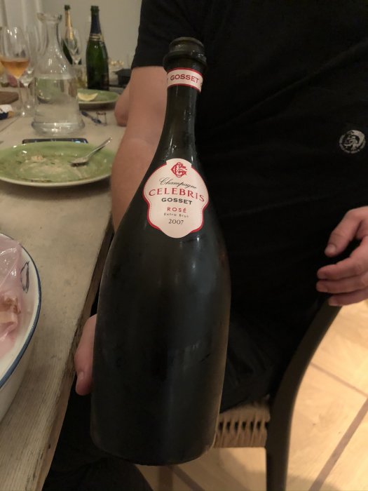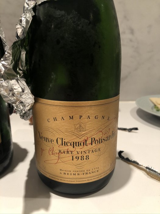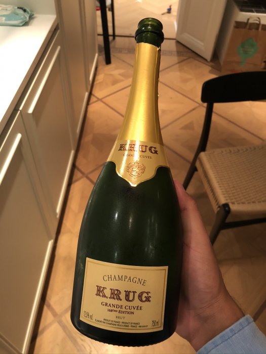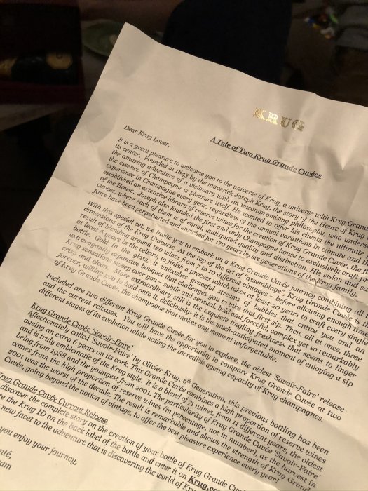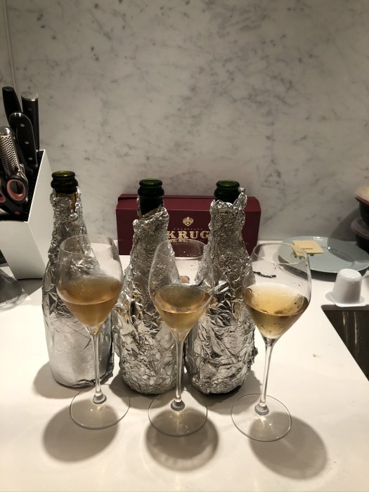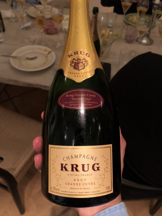Frågan är skickad till Olivier Krug för kommentar. Oerhört häftig och välutvecklad champagne som ändå hade en del bubblor kvar, fullkomligt exploderade i munnen, doft och smak av rostat kaffe och karamell.