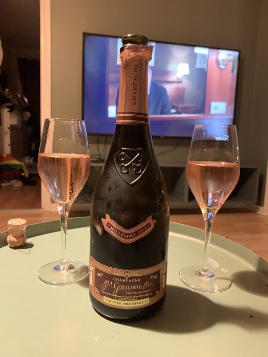 Firar påsk och påskrift för nytt jobb med magnum comtes de champagne 2007. Inser en liten missräkning då flaskan är för tjock för att få på en ”champagne stopper”, lyckades till sist klämma på en sån i plast från systembolaget men tveksamt om den kommer hålla...