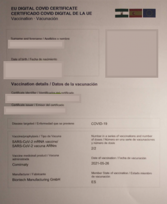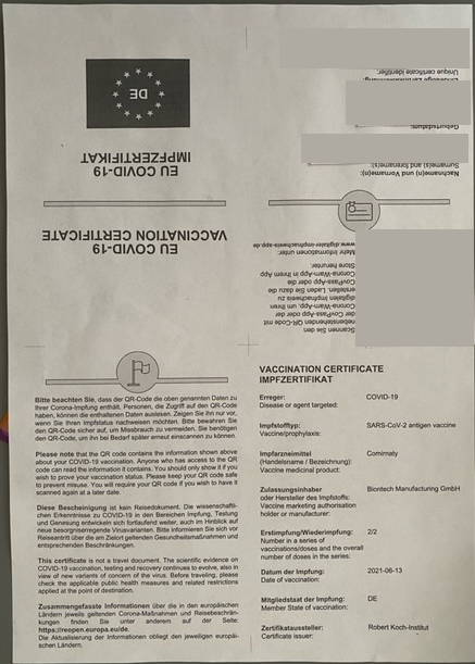 Fick vid detta besök även certifikatet (nedan). När detta sedan lades till med QR kod i de två apparna som är certifierade för användning av EU certifikat här i Tyskland så nämns att det är sista dosen i serien (2/2), vaccinationsdatum för dos 2 samt xx dagar kvar till fullständigt skydd.