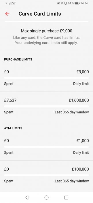 Jag har GBP 9000 för "Max single purchase", detta är även den limit jag har för "Daily limit". Desa limits ahr varit samma sedan dag 1, och har alltså varken ökat eller sänkts under årens gång. Jag har Curve Black Legancy.