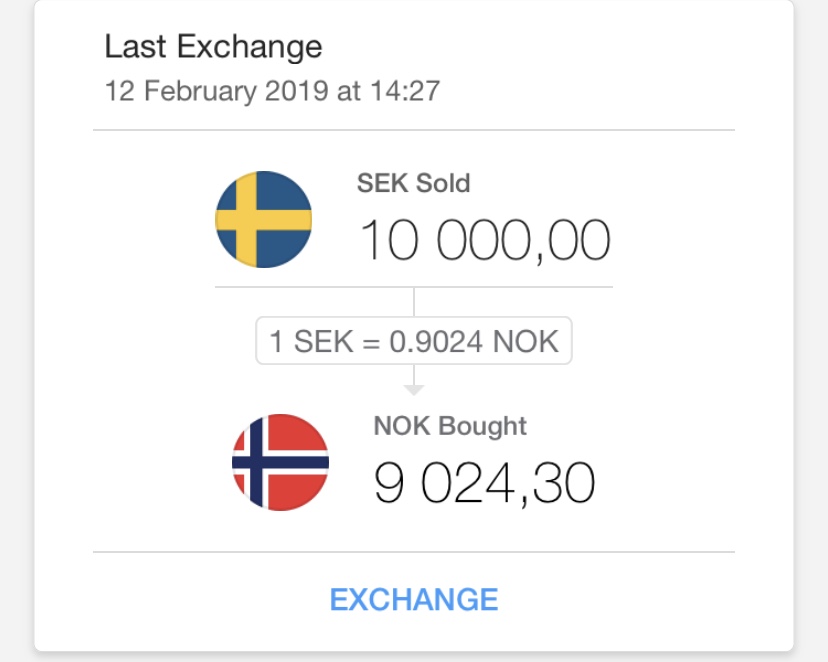 Växlade även in hälften av mina 20k på TW idag till NOK vilket passar bra då jag befinner mig där nu någon dag. Knappt 3,5%, 10öre/p, kostade det för 35p/100sek extra. Totalt 60p/100sek känns fint!